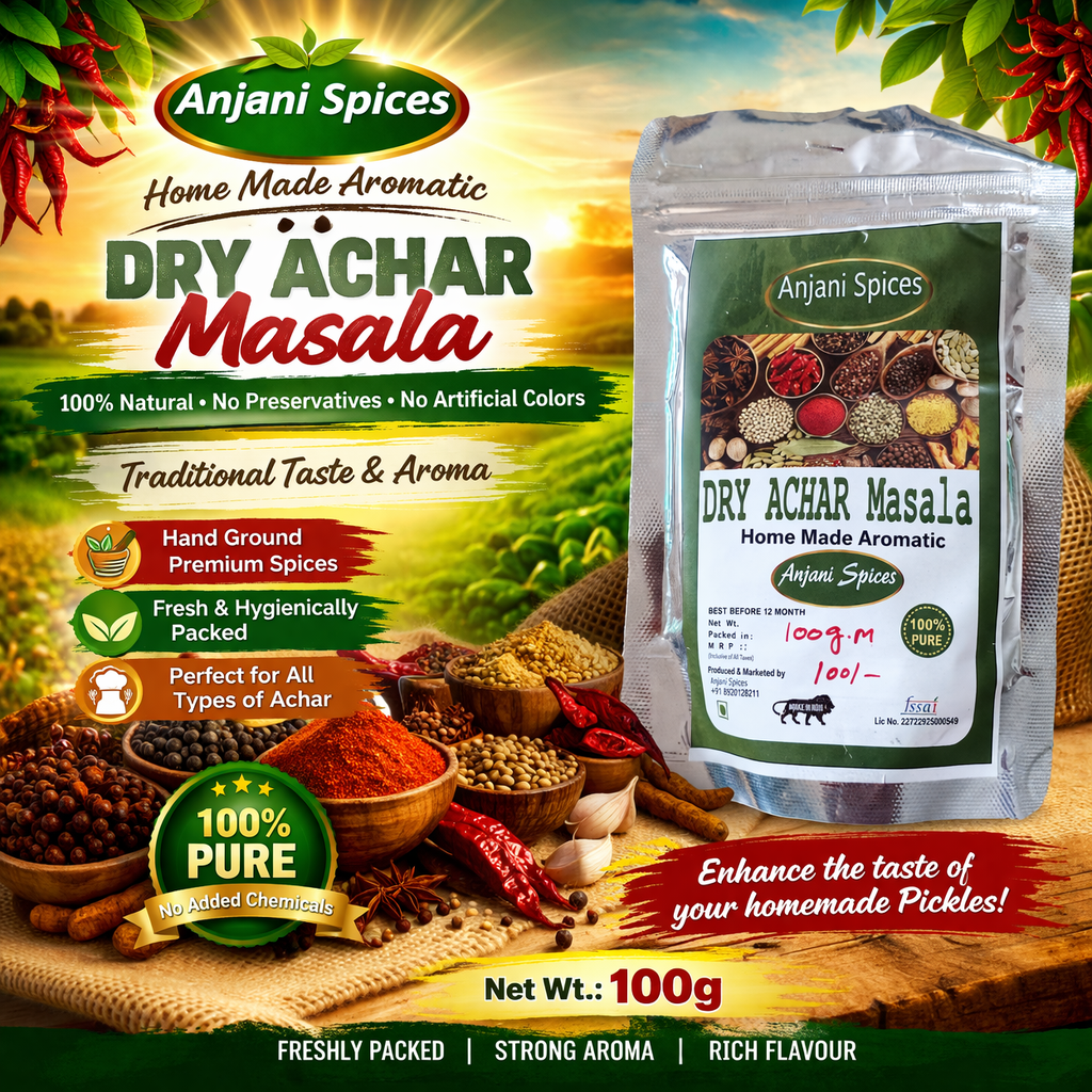 Prepare flavorful, authentic pickles at home with Anjani Spices Dry Achar Masala, a carefully crafted blend of premium spices designed to bring out the perfect taste in every achar. Made using traditional recipes, this masala offers a balanced mix of tangy, spicy, and aromatic flavors.