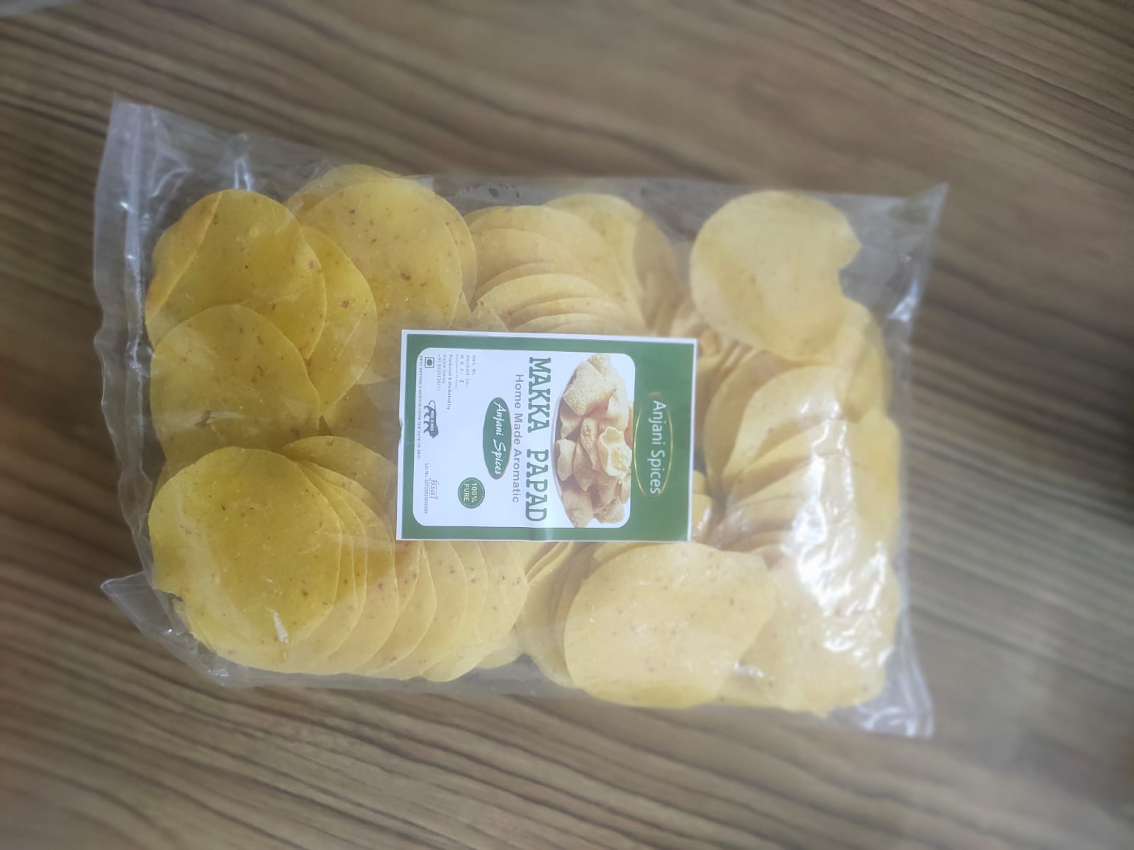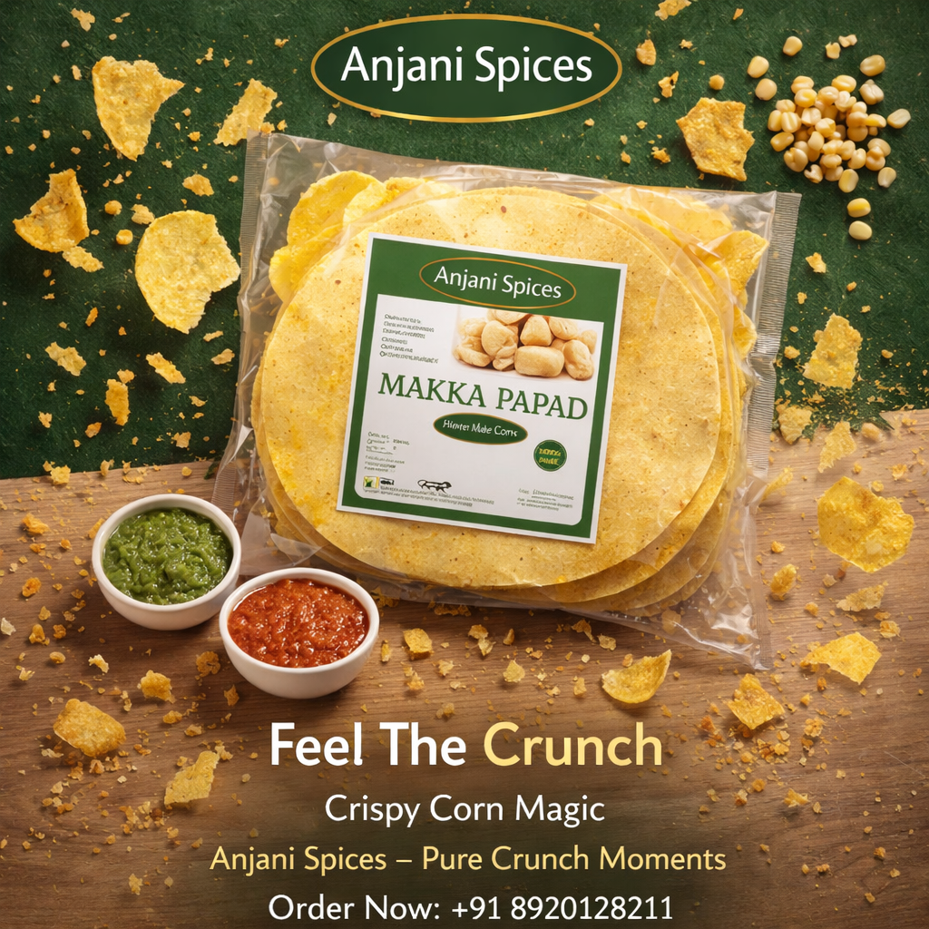 Enjoy the irresistible crunch of Anjani Spices Makka Papad. Made from premium corn, this crispy and flavorful snack is perfect for meals, tea-time, and gatherings.