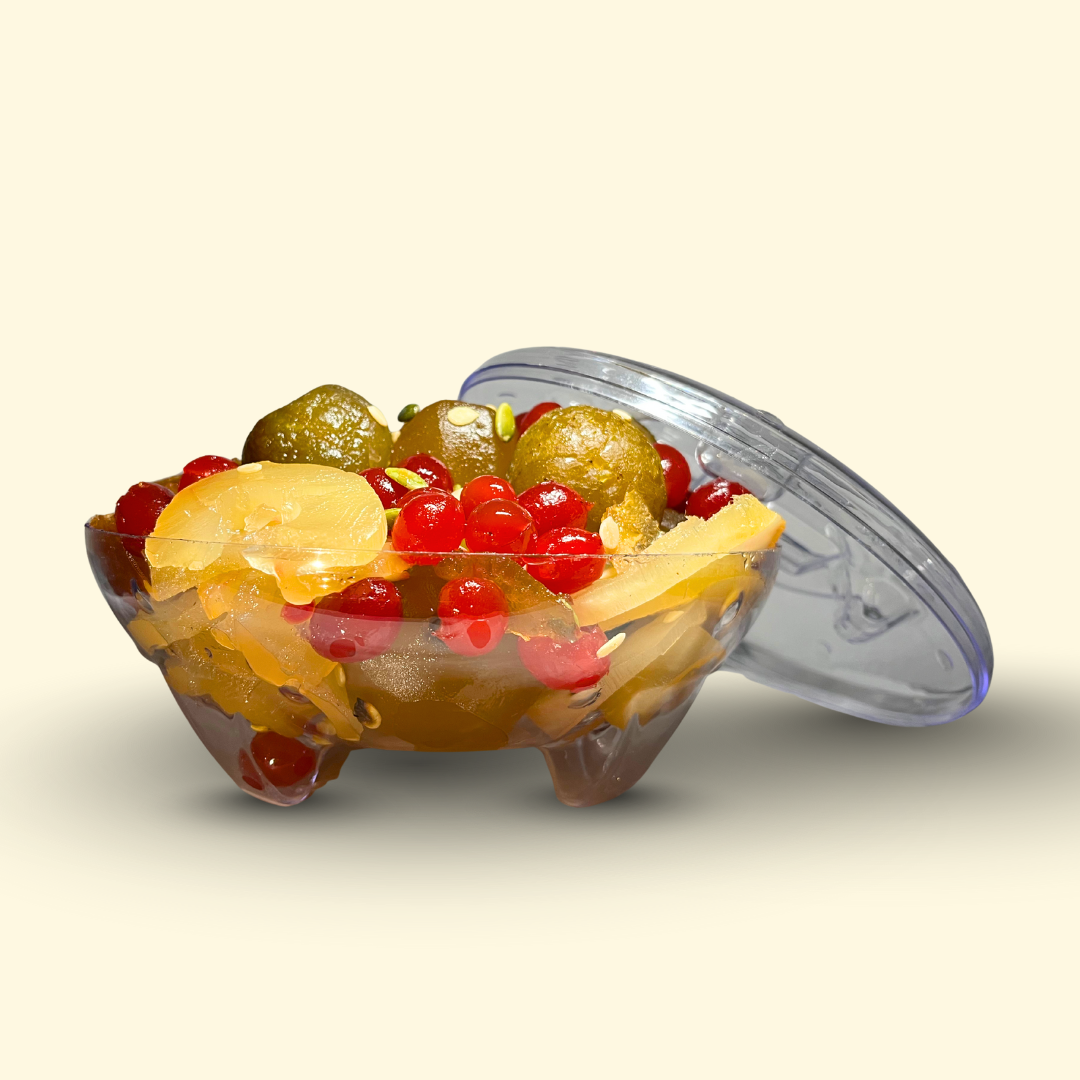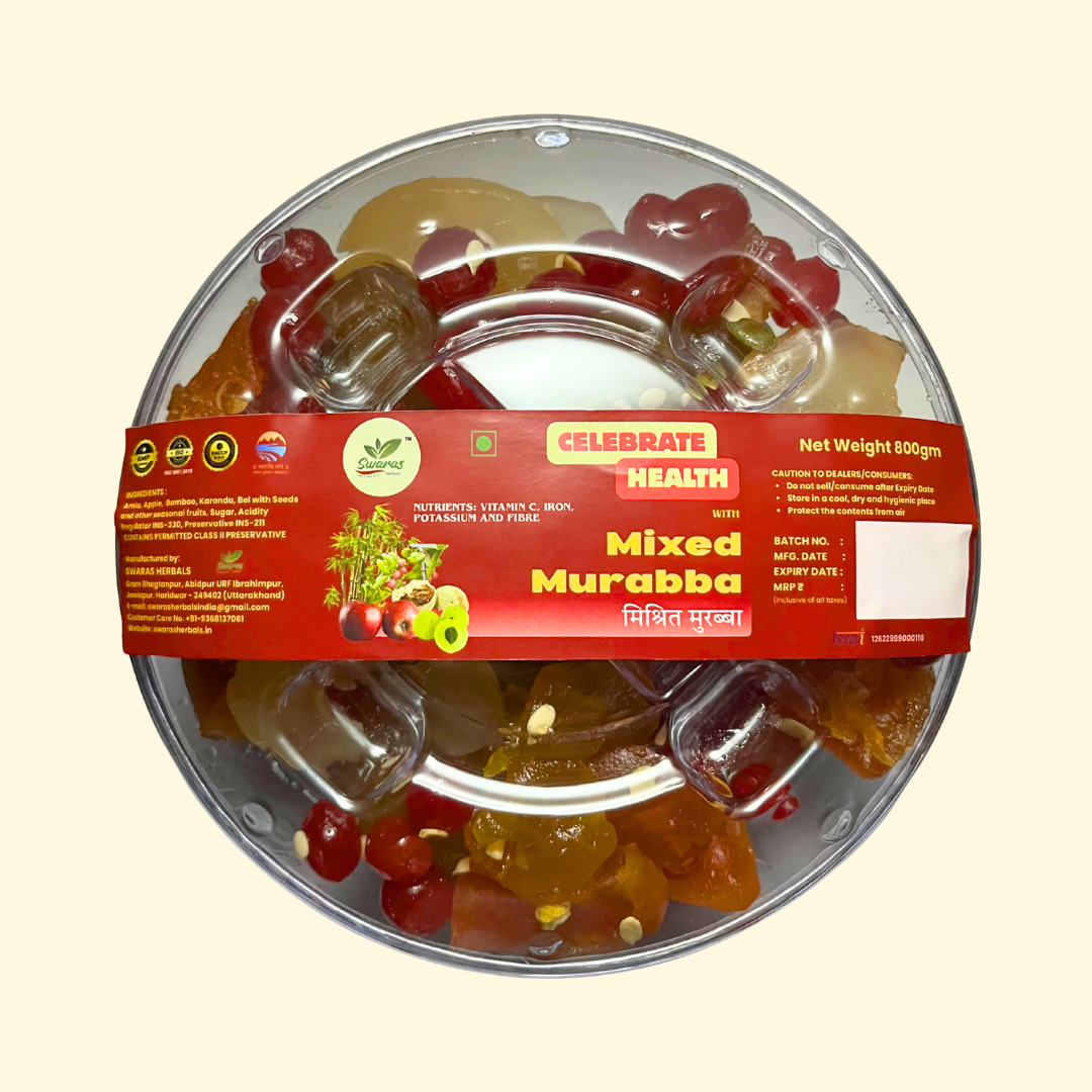 Experience the wholesome richness of Swaras Herbals Mixed Murabba, a delicious fusion of five Ayurvedic fruits – Amla, Apple, Bamboo, Bel and Karonda. Infused with a topping of wholesome seeds, this murabba brings together crunch, sweetness and health in every bite. Amla and Bel support immunity and digestion, Karonda adds a natural tang rich in antioxidants, Apple provides dietary fiber and Bamboo enhances detoxification. Free from artificial colors or preservatives, this murabba is a pure, herbal delicacy that connects you to India’s traditional wellness. Enjoy it as a tasty digestive after meals, a healthy sweet indulgence, or a gift of good health for your loved ones. With festivals around the corner, Swaras Herbals Mixed Murabba also makes a perfect gifting choice, a thoughtful blend of taste, health and tradition beautifully packed for your loved ones. Share the joy of healthy indulgence and Ayurvedic goodness this festive season.
